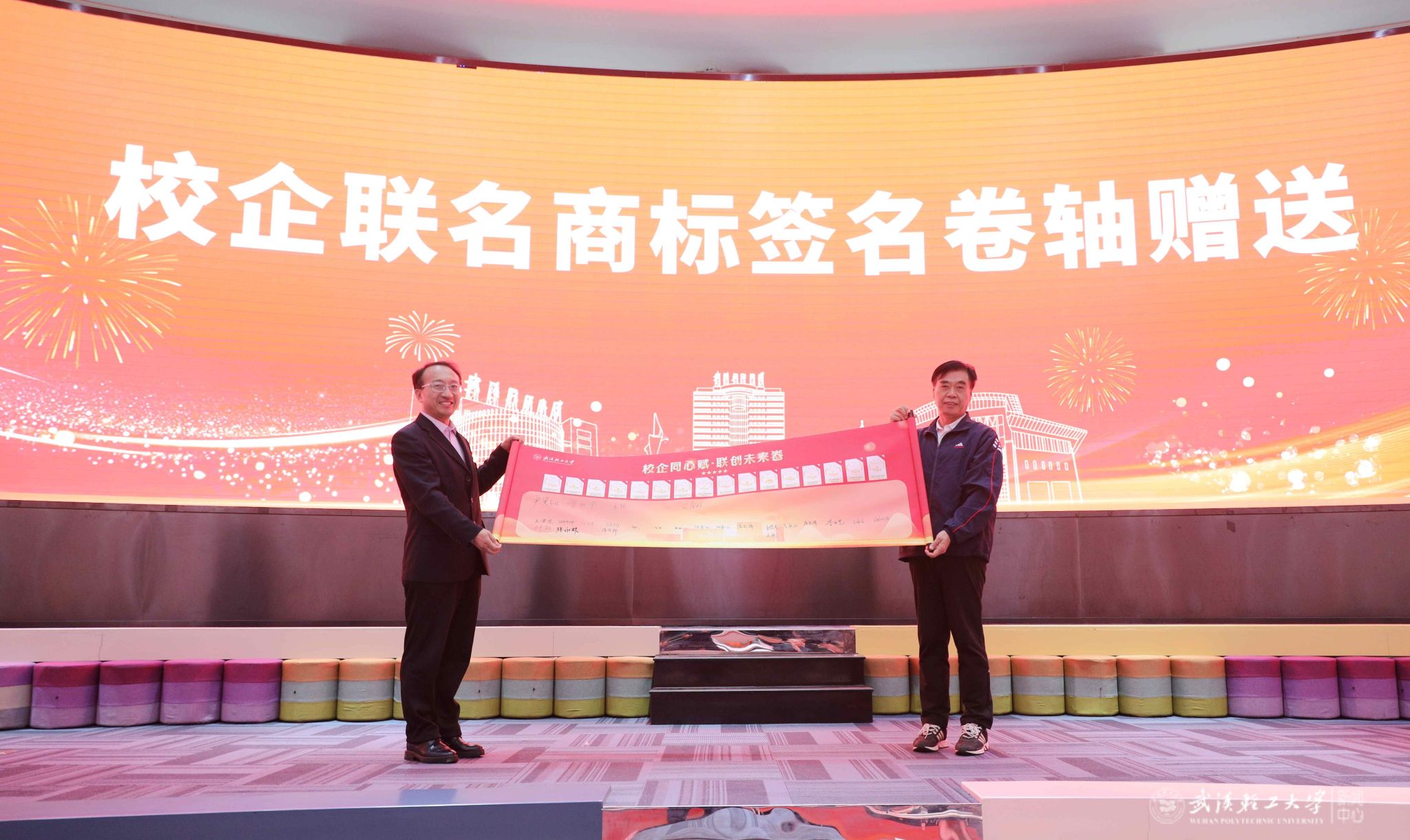 董仕节代表学校接受特殊卷轴。该卷轴不仅收录了16个“轻工优选”联名商标,更承载着学生手写的真挚校庆祝福,用实物承载学校科研转化的硬核实力,将师生的爱校情怀化为可留存、永铭记的校园精神印记。