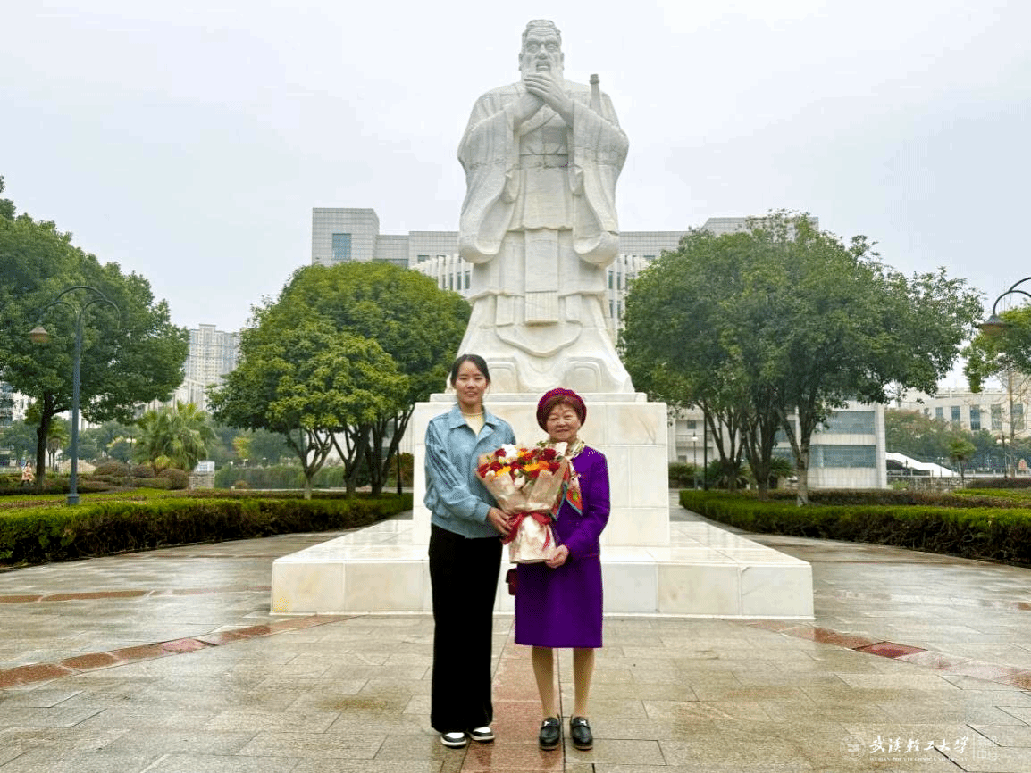 活动中,“木蘭”奖学金(朱崇淑2021年9月15日在我校设立的奖学金)获奖学子代表、食品学院学生代表手捧鲜花,向朱崇淑校友表达敬意与感谢。朱崇淑关切询问“木蘭奖学金获奖学子近况,勉励大家潜心学业、回报社会与母校。当得知获奖学生王吉祥曾作为受阅队员参加九三阅兵仪式时,朱崇淑校友特别称赞她,这份特别经历不仅展现了当代青年“强国有我”的青春风采,更以行动诠释了轻工学子的责任担当,并邀请她在校园孔子像前合影留念,定格下温馨而有意义的瞬间。